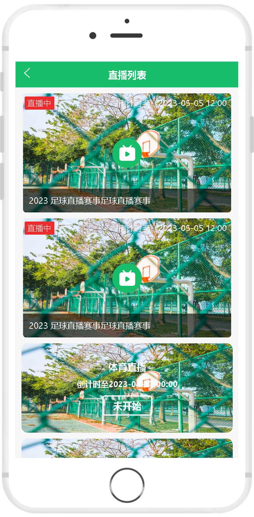 增加小程序直播功能,可用于体育赛事直播,可设置首页推荐直播,直播列表功能。